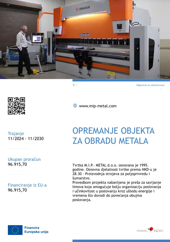 Provedbom projekta nabavljena je preša za savijanje limova koja omogućuje bolju organizaciju poslovanja i učinkovitost u poslovanju kroz uštedu energije i vremena što dovodi do povećanja obujma